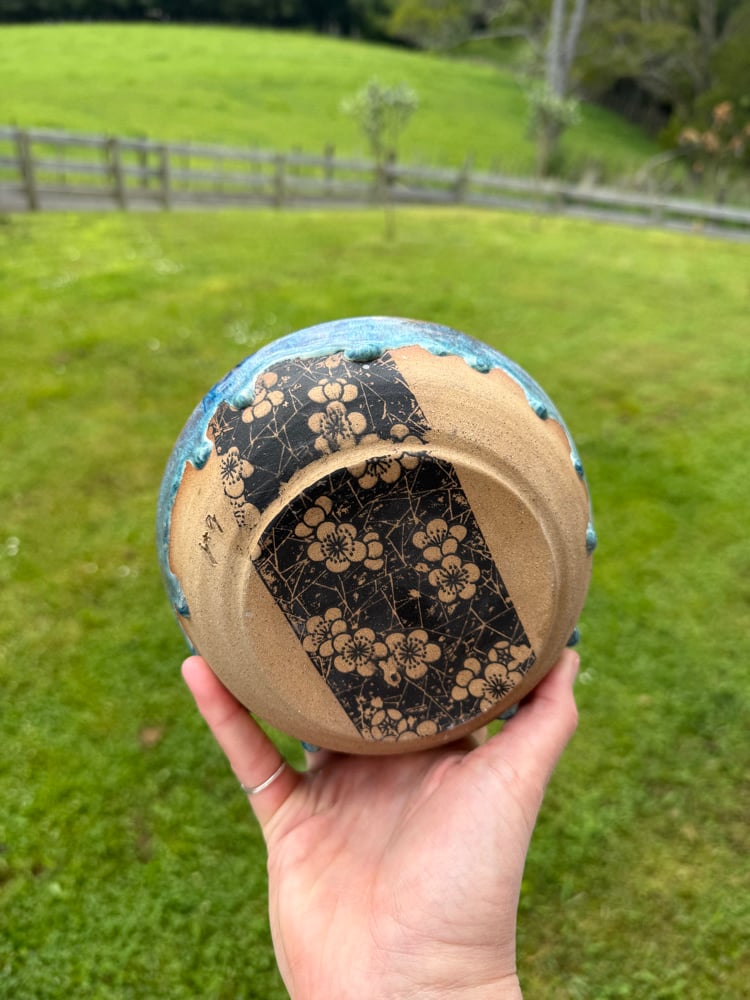 Small sized wobbly bowl with a runny blue glaze and flower print perfect for a modest breakfast!